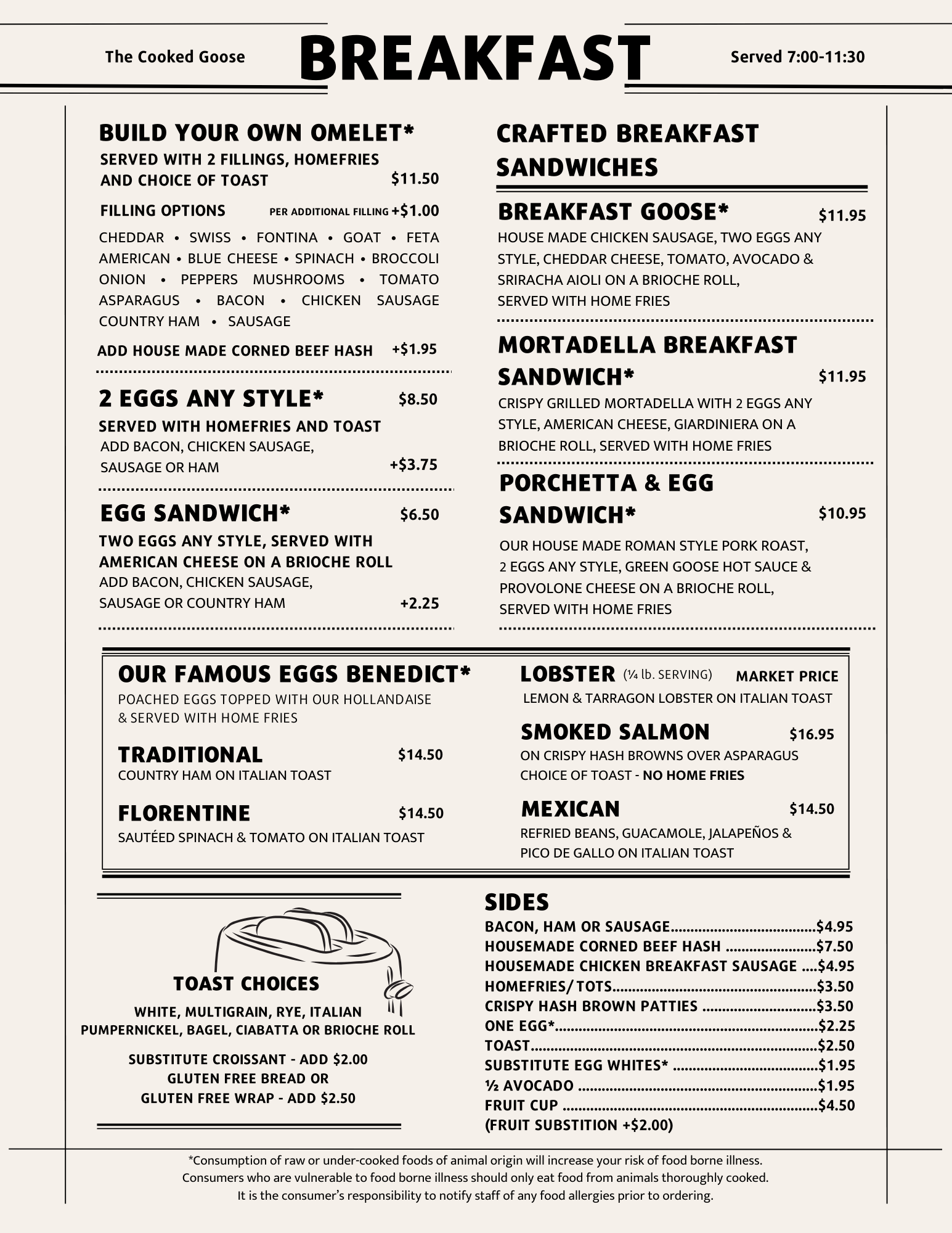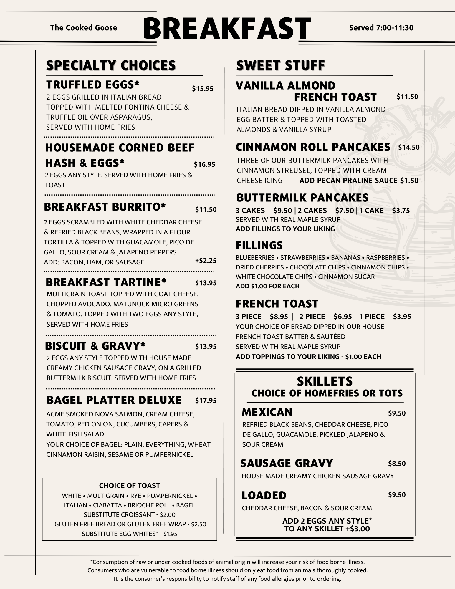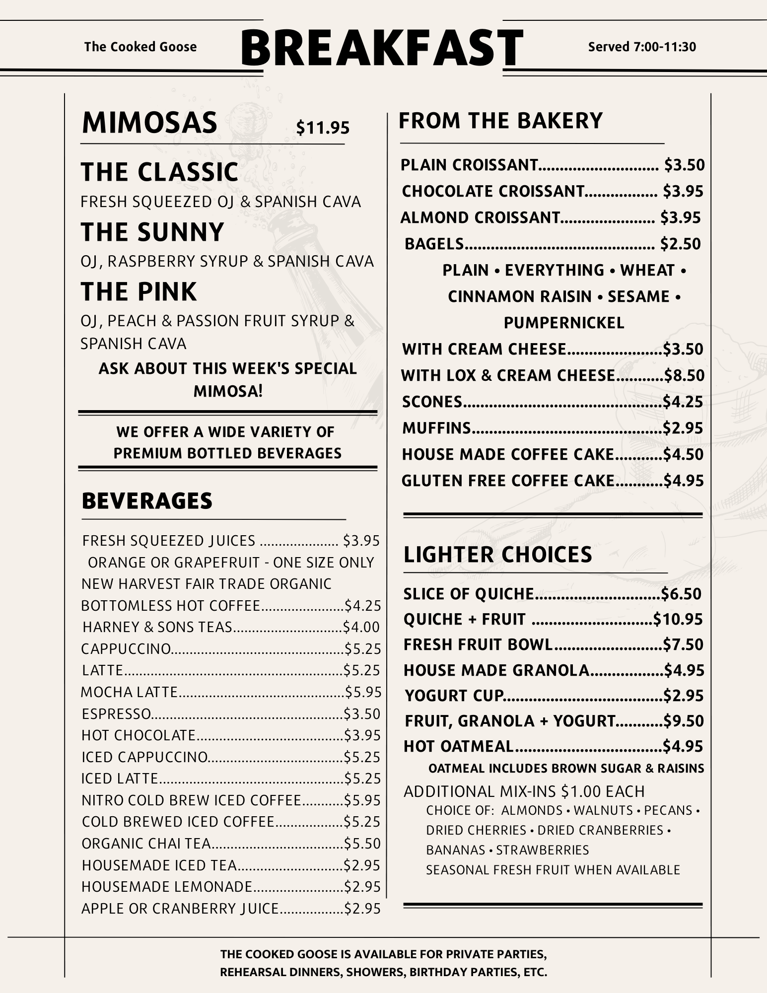 Please note that on busy mornings, breakfast may extend slightly while our kitchen completes breakfast orders and transitions to lunch.