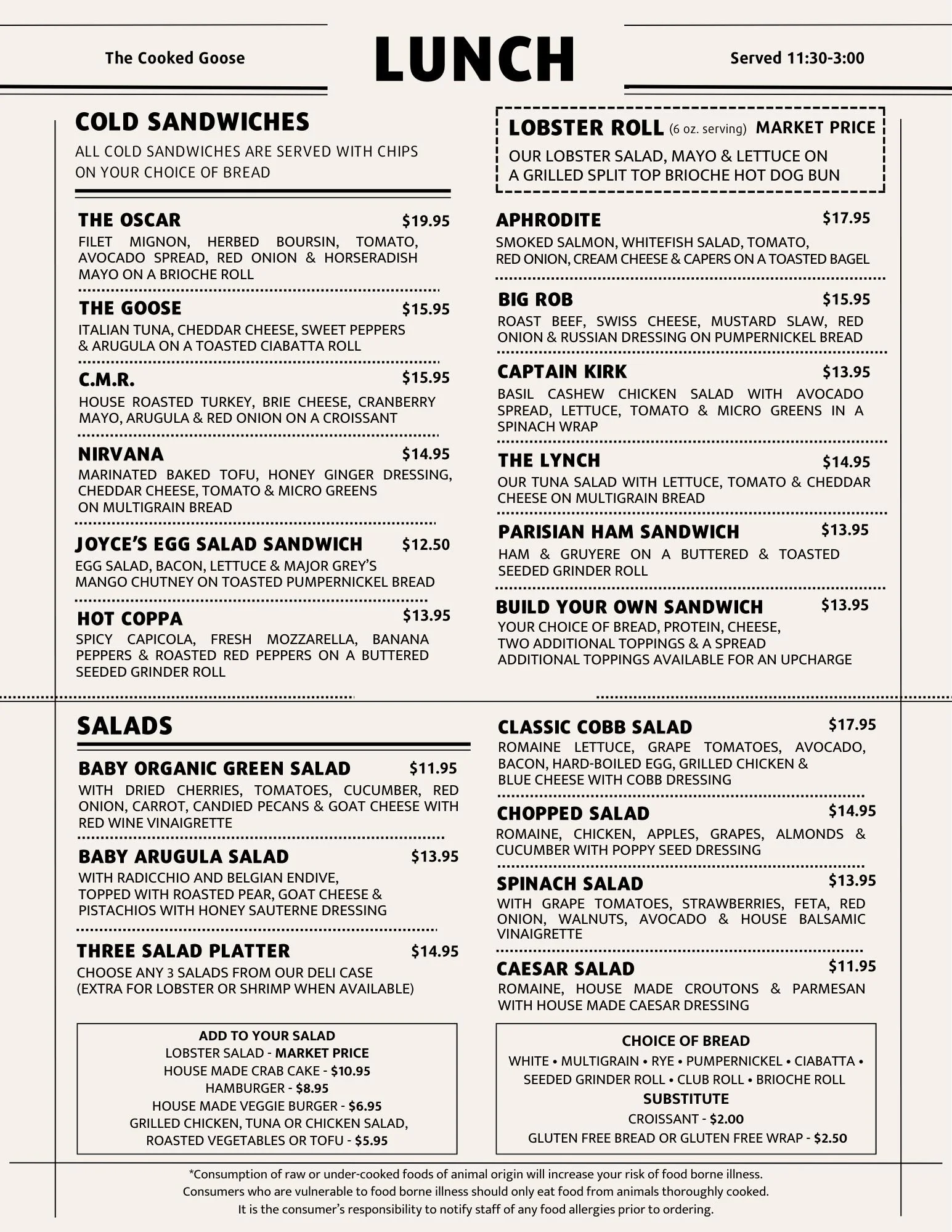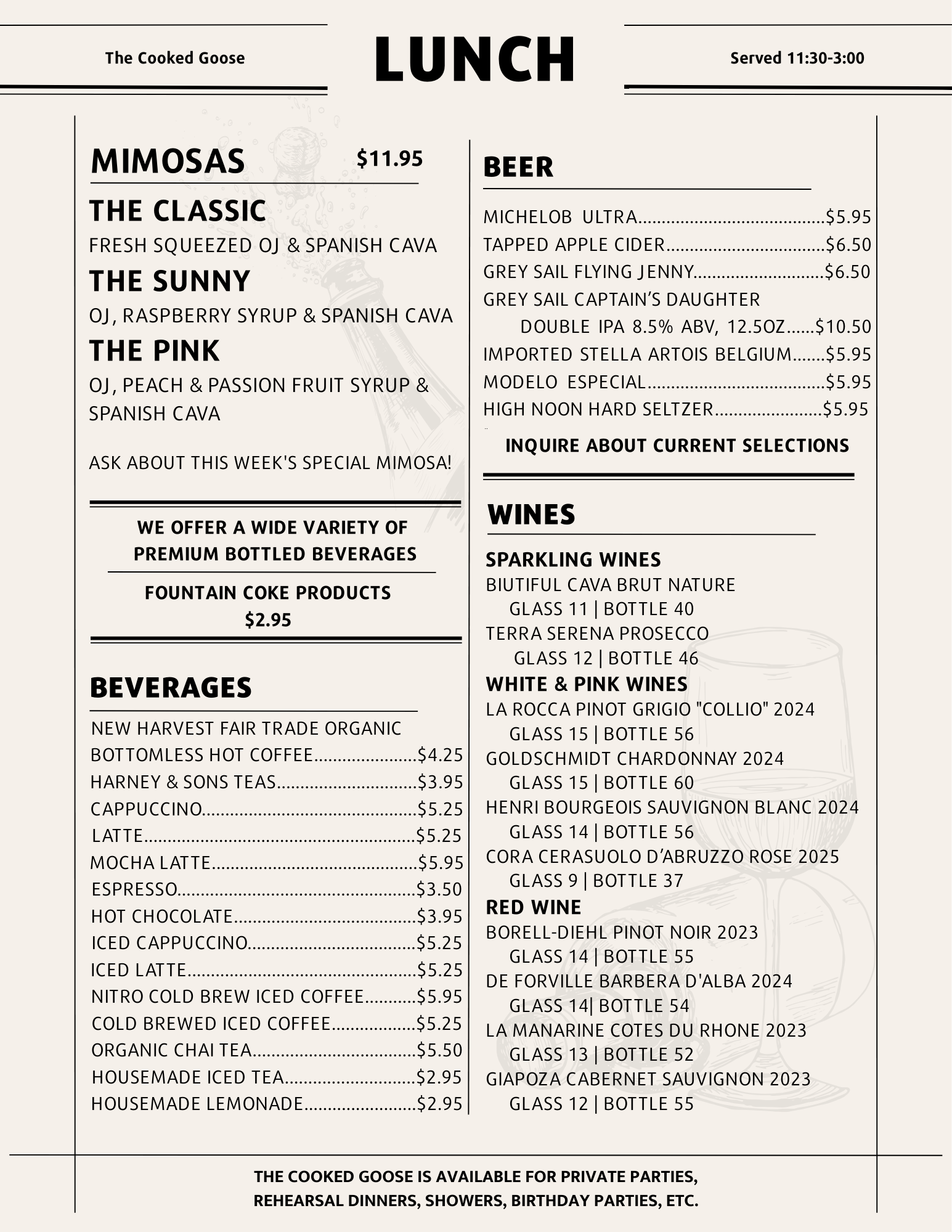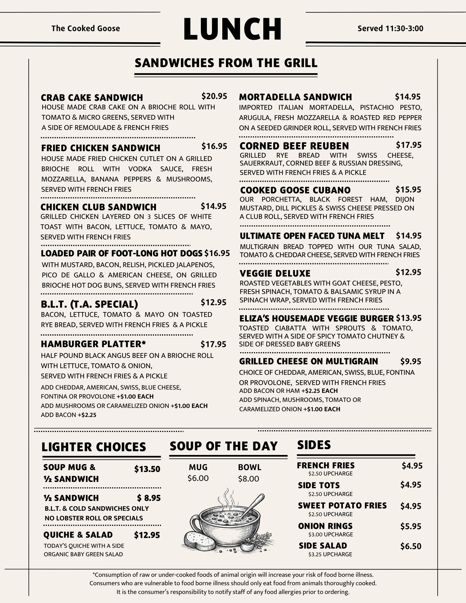 Please note that on busy mornings, breakfast may extend slightly while our kitchen completes breakfast orders and transitions to lunch.